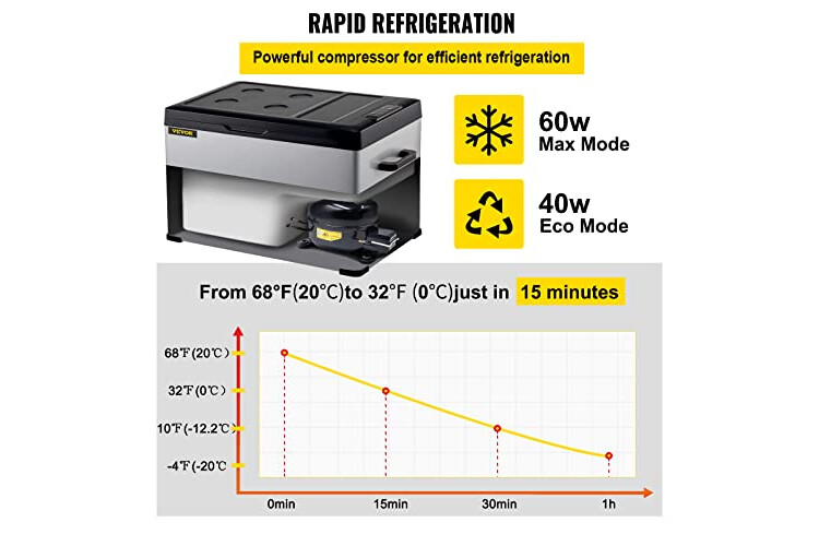 Refrigeración Eficiente: Con la tecnología de refrigeración del compresor, este congelador para automóvil de 12 V podría lograr un enfriamiento rápido de 68 ℉/20 ℃ a -32 ℉/0 ℃ en 15 minutos, manteniendo su comida fresca. Hay 2 modos para elegir: el modo ECO para ahorrar energía o el modo MAX para un enfriamiento rápido.