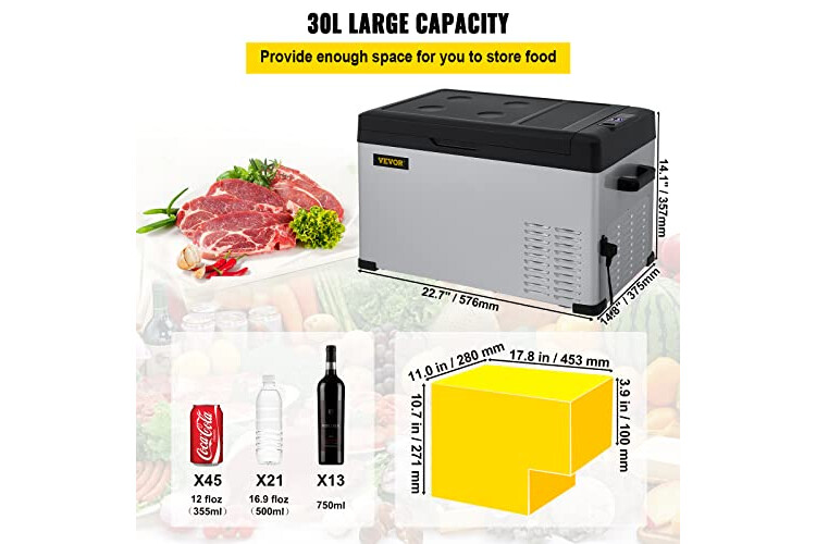 Espacio de Almacenamiento de 32 Cuartos: Esta nevera portátil con capacidad de 30 L/32 cuartos de galón es lo suficientemente grande como para contener 45 latas de refresco de cola de 330 ml/11,1 floz, 21 botellas de bebidas de 550 ml/18,6 floz y 13 botellas de vinos tintos de 750 ml/25,3 floz. Con la certificación CE, puede almacenar muchas bebidas, verduras, frutas, mariscos, carne, productos para el cuidado de la piel, leche materna en él sin preocuparse.