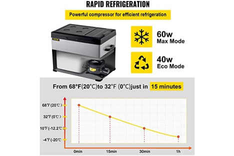 Refrigeración Eficiente: Con la tecnología de refrigeración del compresor, este congelador para automóvil de 12 V podría lograr un enfriamiento rápido de 68 ℉/20 ℃ a -32 ℉/0 ℃ en 15 minutos, manteniendo su comida fresca. Hay 2 modos para elegir: el modo ECO para ahorrar energía o el modo MAX para un enfriamiento rápido.