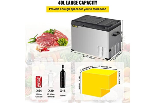 Espacio de Almacenamiento de 42 Cuartos: Esta nevera portátil con capacidad de 40 L/42 cuartos de galón es lo suficientemente grande como para contener 54 latas de refresco de cola de 330 ml/11,1 floz, 29 botellas de bebidas de 550 ml/18,6 floz y 16 botellas de vinos tintos de 750 ml/25,3 floz. Con la certificación CE, puede almacenar muchas bebidas, verduras, frutas, mariscos, carne, productos para el cuidado de la piel, leche materna en él sin preocuparse.