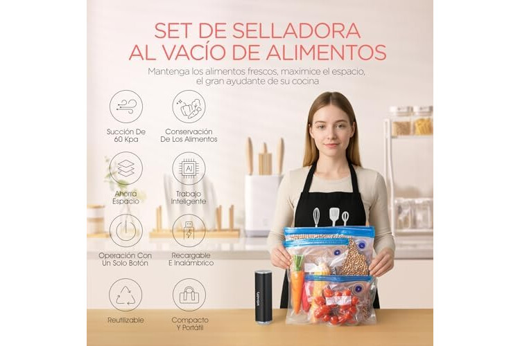 Conservación de alimentos y ahorro de espacio: este sellador al vacío VS210 ayuda sin esfuerzo a extender la vida útil de sus alimentos, preservando su sabor. Además, también puede facilitar el almacenamiento, ahorrar espacio y maximizar el uso del espacio interno del refrigerador.