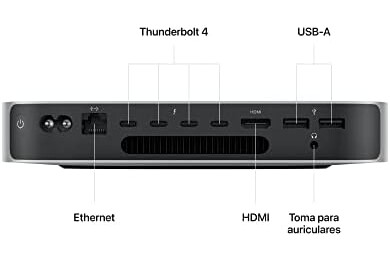 CONECTA LO QUE QUIERAS — El Mac mini con chip M2 Pro incorpora cuatro puertos Thunderbolt 4, dos puertos USB-A, un puerto HDMI, Wi-Fi 6E, Bluetooth 5.3, Gigabit Ethernet y una toma para auriculares. Y si quieres conexiones aún más rápidas, puedes configurar el Mac mini con Ethernet de 10 Gb y disfrutar de una velocidad hasta diez veces superior.