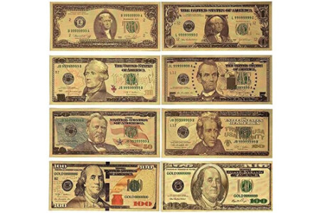 El paquete incluye: 8 billetes de oro de 1 , 2 , 5 , 10 , 20 , 50 , 100 , 100 dólares nuevos.