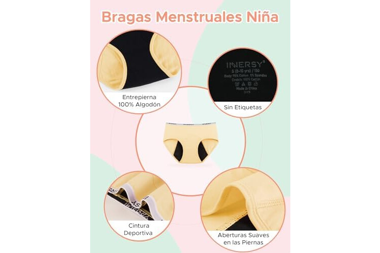 INNERSY Bragas Menstruales Niña Ropa Interior Protección Algodón Braguitas Regla 8-16 Años Pack de 3