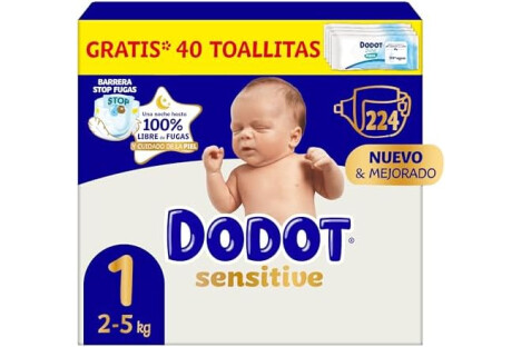 Dodot Pañales Bebé Sensitive, Talla 1 (2-5 kg), 224 Pañales + Regalo de 40 Toallitas Aqua Pure 99% Agua, Hasta 12 h De Protección Antifugas y Cuidado de la Piel, Pack Mensual