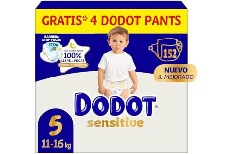 Dodot Pañales Bebé Sensitive Talla 5 (11-16 kg), 152 Pañales + 4 Pants de Regalo, Hasta 12 h De Protección Antifugas y Cuidado de la Piel, Pack Mensual