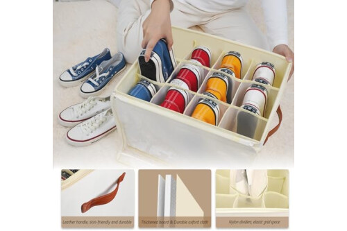 Espacio de rejilla flexible: los divisores de tela de nailon permiten un espacio flexible en cada compartimento, por lo que tanto los zapatos pequeños como los grandes se pueden insertar fácilmente en los compartimentos, una función que otros organizadores de zapatos con divisores duros no ofrecen