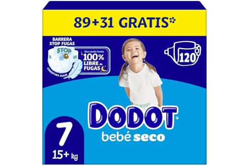 Dodot Pañales Bebé-Seco, Talla 7 (15+ kg), 120 Pañales, Una Noche Hasta Un 100% Libre De Fugas, Pack mensual