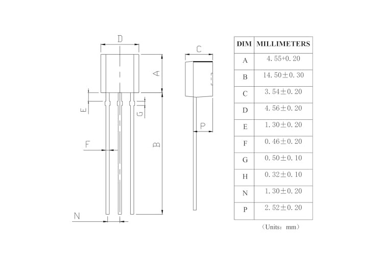 Voltaje base del colector: 60V; Corriente de colector: 200mA; Paquete: TO-92.