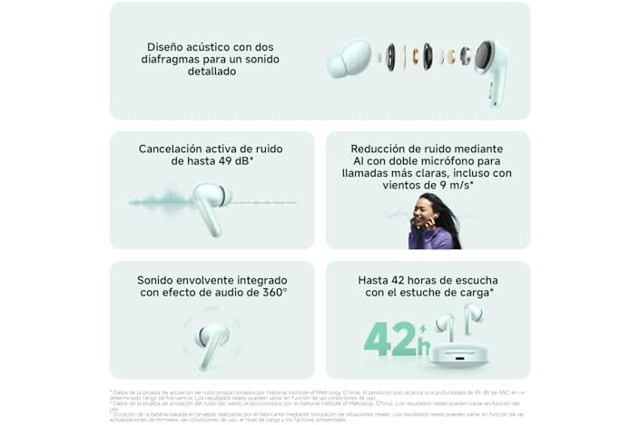 Cancelación activa de ruido de hasta 49 dB y 2 kHz, y ofrece 3 modos para diferentes entornos acústicos; soporte ANC personalizado: optimiza automáticamente el rendimiento ANC según la situación de uso cada vez que lo llevas puesto
