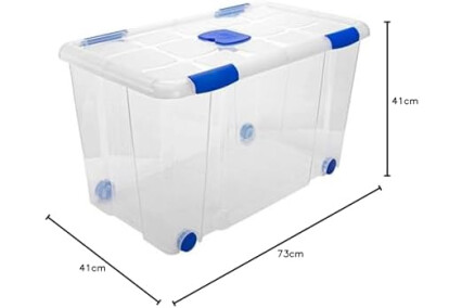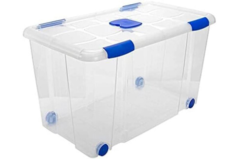 AC - Caja de ordenación con Tapa y Ruedas de plástico Transparente N.º 12. Contenedor para almacenar Juguetes, Libros, Ropa, Mantas. Capacidad 90 litros. Dimensiones Aprox.: 73,2 x 41,2 x 31 cm