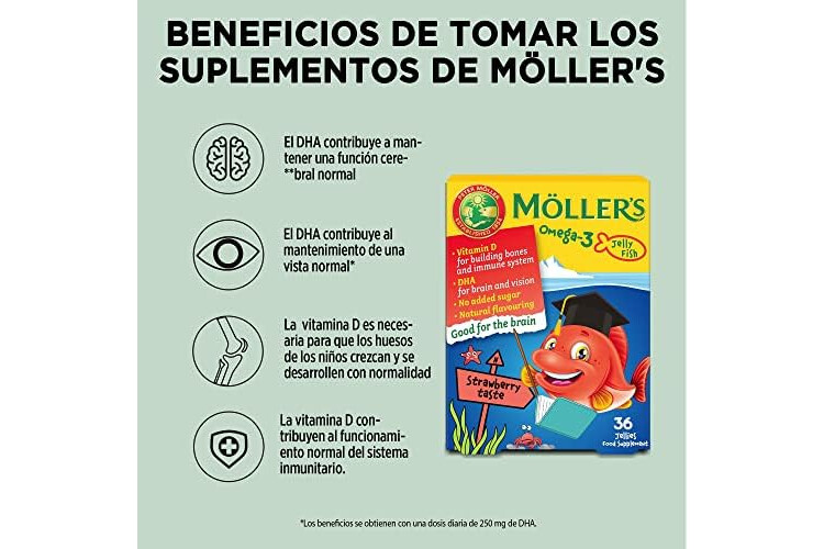 PARA NIÑOS Y ADULTOS - Los peces de gelatina de omega 3 Möller’s satisfacen las necesidades de omega 3. Las OMEGA 3 cápsulas de aceite de hígado de bacalao nórdico no contienen azúcares añadidos.