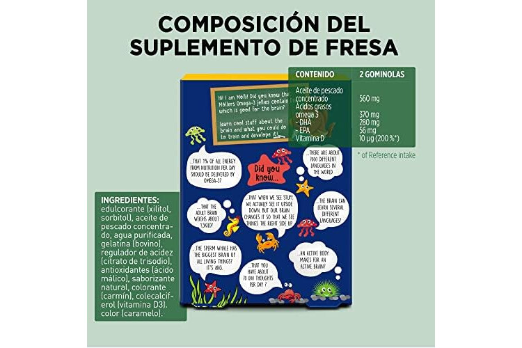 FÁCILES DE MASTICAR Y TRAGAR – Mollers omega 3, gracias a su textura suave y blanda, los peces de gelatina de omega 3 Möller's tienen un sabor excelente y son fáciles de masticar y tragar. Aroma natural y sin azúcares añadidos. Se lo puedes dar a tus hijos para desayunar o meterles dos piezas en la fiambrera.