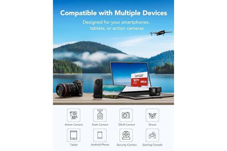 Amplia compatibilidad: La tarjeta de memoria Lexar tiene alta compatibilidad con diferentes tipos de dispositivos, incluyendo teléfonos móviles, tabletas (incluyendo Android y PC), drones, cámaras de acción, DSLR y videocámaras Full HD.