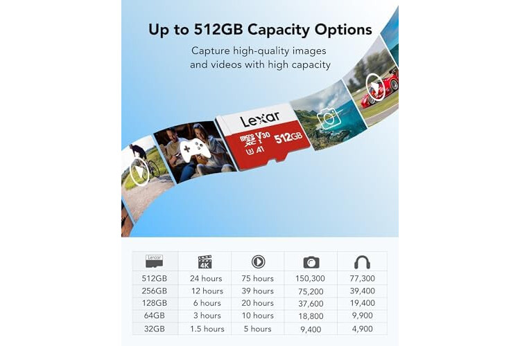 Amplia compatibilidad: La tarjeta de memoria Lexar es altamente compatible con diferentes tipos de dispositivos, incluyendo teléfonos inteligentes, tabletas (Android y PC), drones, cámaras de acción, DSLR y videocámaras Full HD.