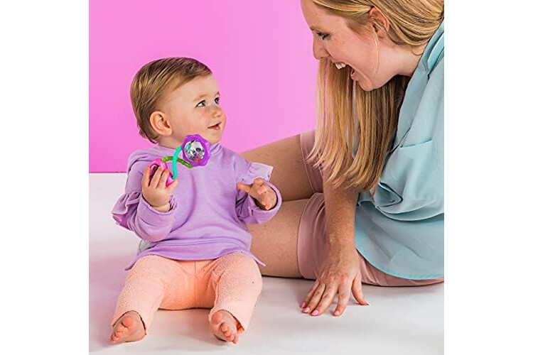 Bright Starts Rattle & Shake, Sonajero con forma de pesa para bebé, juguete para agitar y morder, color rosa, a partir de 3 meses
