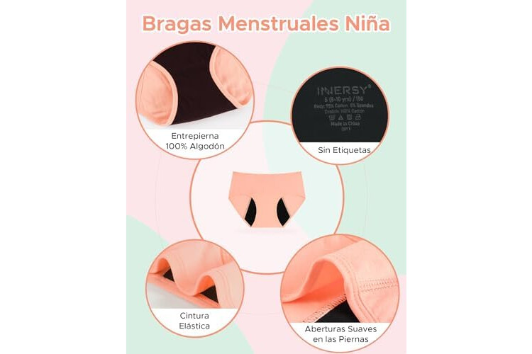 INNERSY Bragas Menstruales Niña Ropa Interior Protección Algodón Braguitas Regla 8-16 Años Pack de 3