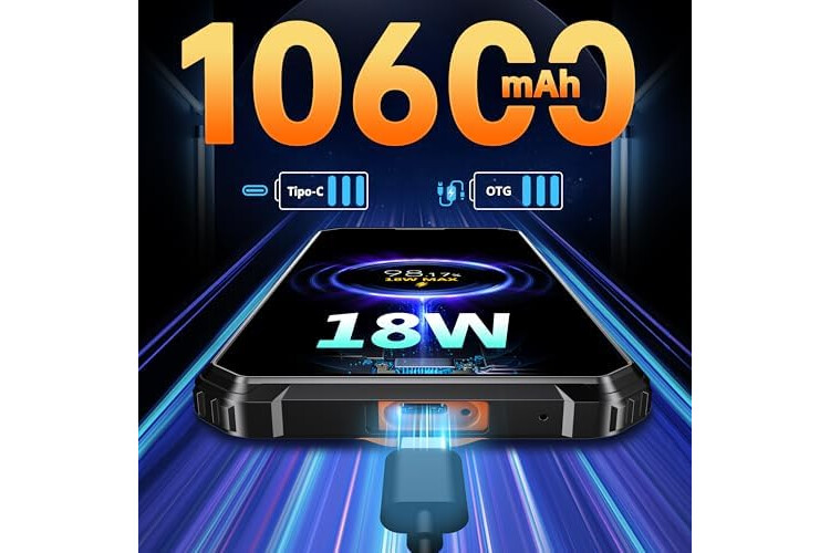 【Batería de Gran Capacidad de 10600】OUKITEL G1 movil todoterreno tiene una capacidad de batería de hasta 10600 mAh. Manténgase encendido en sus aventuras de viaje sin preocuparse por quedarse sin energía. Con una sola carga, el G1 tiene un tiempo de espera de hasta 1000 horas, un tiempo de conversación de hasta 60 horas, un tiempo de visualización de videos de 18 horas y un tiempo de juego de 10 horas. Además, elegimos una potencia de carga más rápida de 18 W para la batería del teléfono.