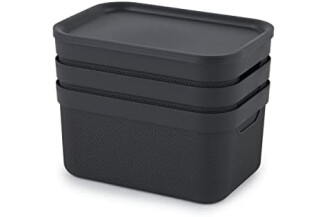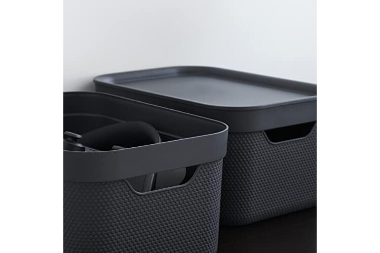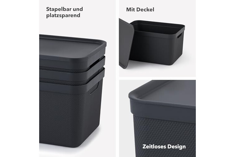 • Set de 3 cajas de 5 litros | Formato A5 | 26,5 x 18,5 x 20 cm cm (largo x ancho x alto) | Caja apilable negra (charcoal black), tapa antracita