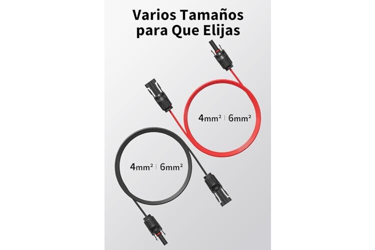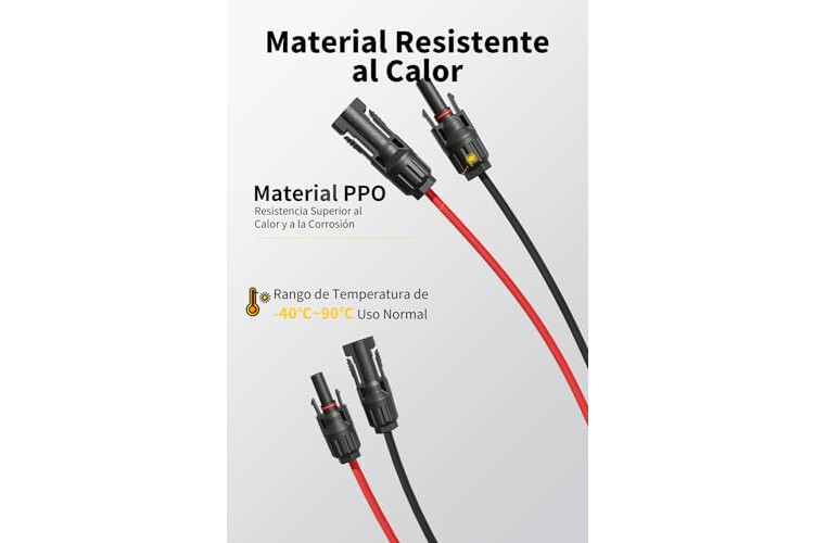 【Especificaciones del Cable Solar】Cable solar profesional multi-contacto 4, sección transversal: 4 mm²/6 mm², rango de temperatura: ambiente -40 ℃ ~ +90 ℃, voltaje nominal: 1500 V, corriente nominal: 4 mm²/30A, 6 mm²/50A.