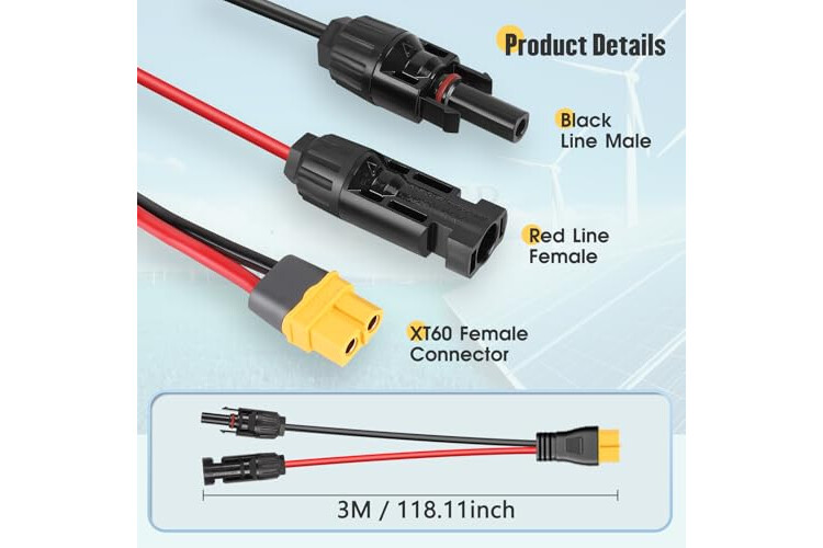 Cable de 12AWG: El cable está hecho de cobre puro 12 AWG alambre, buena conductividad eléctrica. Longitud: 3 metros, SUFICIENTE holgura para mover su panel solar