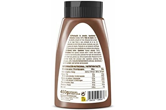 🌰 [ INNOVACIÓN: TEXTURA FLUIDA TIPO "SIROPE" ] Crema de Almendra fluida. Olvídate de la cuchara y de mancharlo todo. Gracias a un molido ultra-fino y filtrado, conseguimos una crema extra líquida y cremosa, ideal para servir directamente. Su exclusivo envase con tapón antigoteo permite dosificar con precisión sobre tus platos. ¡Agitar vigorosamente y servir!