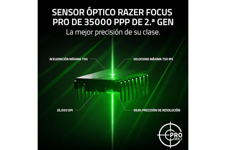 Sensor óptico Razer Focus Pro 35K DPI Gen-2 - La mejor precisión de su clase: Experimenta un rendimiento de seguimiento de nivel profesional en una mayor variedad de superficies, incluido el cristal, con el apoyo de funciones inteligentes y ajustes por pasos de 1 PPP para una puntería y un control más granulares.