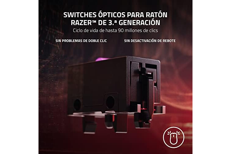 Switches ópticos para ratón Razer de 3 generación: Con un ciclo de vida mejorado de 90 millones de clicks sin problemas de doble click, además de un funcionamiento vertiginoso de 0,2 ms sin retraso de rebote, el ratón garantiza la fiabilidad y velocidad necesarias para los esports
