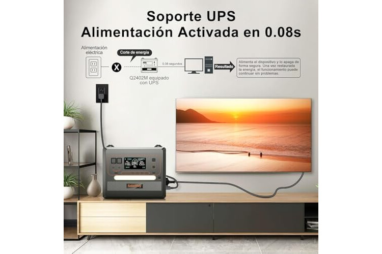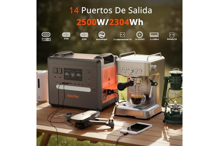 【Potencia versátil 2500W/2300Wh】 Esta estación de energía portatil alimenta hasta el 99% de dispositivos (microondas, portátiles). Con 12 salidas (2xAC, USB-C 100W, DC), es el generador solar portátil ideal para camping, emergencias y viajes. Su diseño compacto la convierte en la power station perfecta para aventuras al aire libre.
