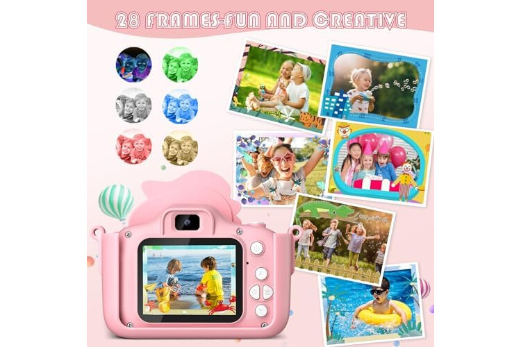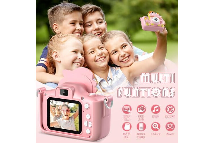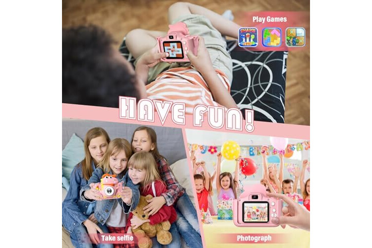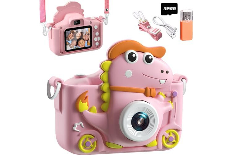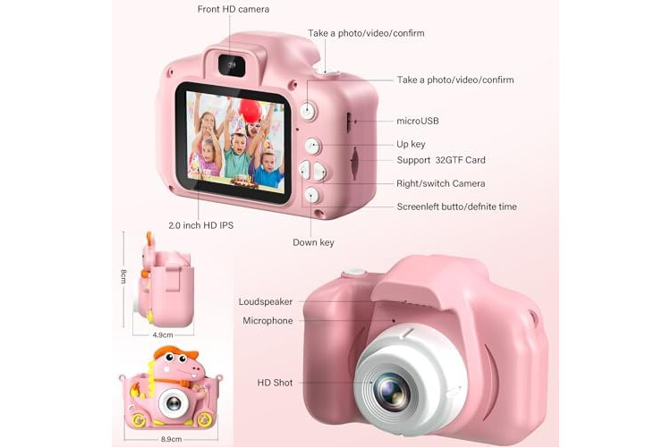 Camara Fotos Infantil Dinosaurio, 1080P Camara De Fotos para Niños, 2" HD Selfie Camara Fotos Niños 32G, Regalo para niños y niñas 3 4 5 6 7 8 9 10 11 12 años, Niños Juguetes Juegos (Rosa)