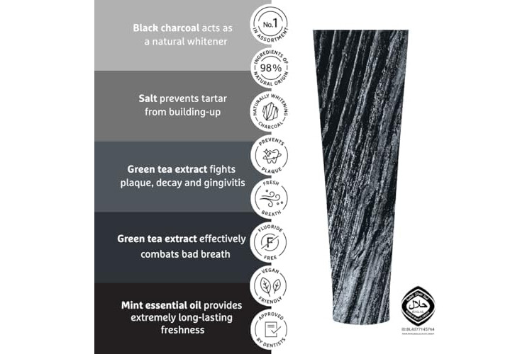 🦷INGREDIENTES ACTIVOS: El carbón negro es conocido por sus efectos limpiadores e iluminadores. Teavigo es un extracto de té verde que es eficaz contra la placa dental, la caries dental, la gingivitis y el mal aliento.