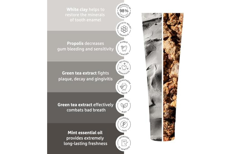 🦷INGREDIENTES ACTIVOS: La arcilla blanca ayuda a restaurar los minerales del esmalte dental. El propóleo reduce la sensibilidad de los dientes y las encías. Kalident incluso ayuda a reparar microlesiones en el esmalte.