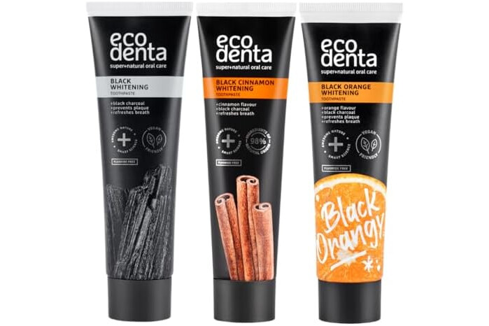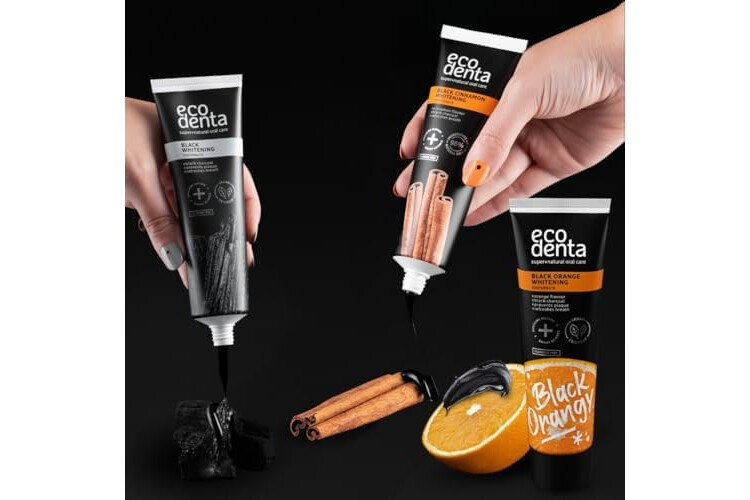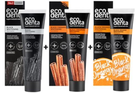 Ecodenta Black Whitening - Juego de 3 pastas dentales blanqueadoras de carbón negro, 100 ml, pasta de dientes blanqueadora con canela negra, 100 ml, pasta de dientes blanqueadora con sabor a naranja,