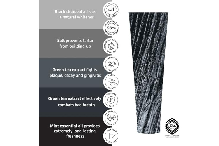 Ingredientes activos: carbón de madera naturalmente blanqueador, conocido por su efecto limpiador y blanqueador. La canela se conoce como un remedio para el mal aliento. Teavigo es un extracto de té verde con propiedades anti-placa, anti-caries y anti-gingivitis, así como contra el mal aliento.