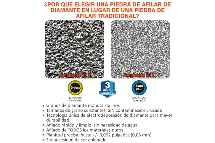 ¿Por qué Elegir Diamante sobre Piedras de Afilar Tradicionales? El diamante afila incluso los aceros más duros, incluidos aceros de alto rendimiento como la serie CPM, M390 y Elmax. A diferencia de las piedras de afilar tradicionales, las placas de diamante mantienen su planitud, no necesitan aplanado, funcionan en seco sin ensuciar y ofrecen resultados más eficientes y consistentes.