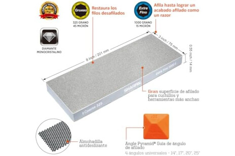 Doble Cara con Grano 325 (45 micras) / 1000 (15 micras): El grano grueso 325 (45 micras) restaura filos desafilados; el grano extra fino 1000 (15 micras) perfecciona el filo hasta un acabado afilado como navaja — ofreciendo afilado y acabado eficientes en una sola piedra.