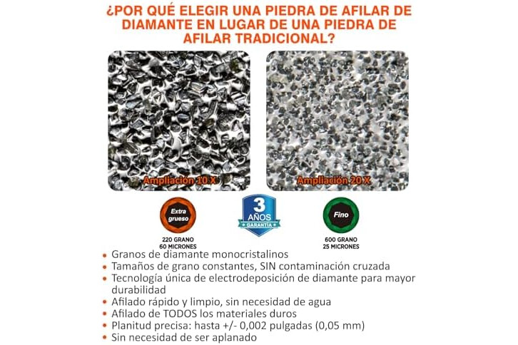220 Grit (60 micrones) / 600 Grit (25 micrones) Doble Cara: El grano extra-grueso 220 (60 micrones) restaura bordes severamente dañados; el grano fino 600 (25 micrones) afina y mejora la agudeza, ofreciendo perfilado y afilado rápidos y eficientes en una sola piedra.