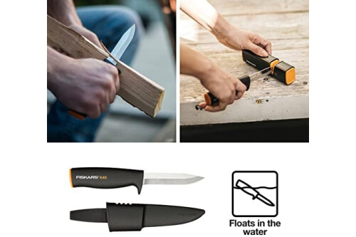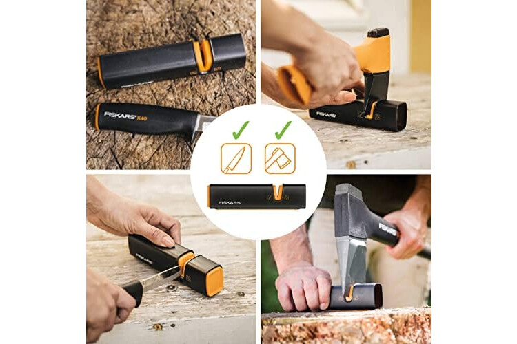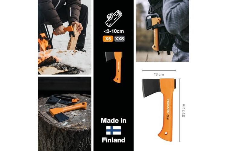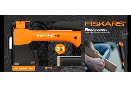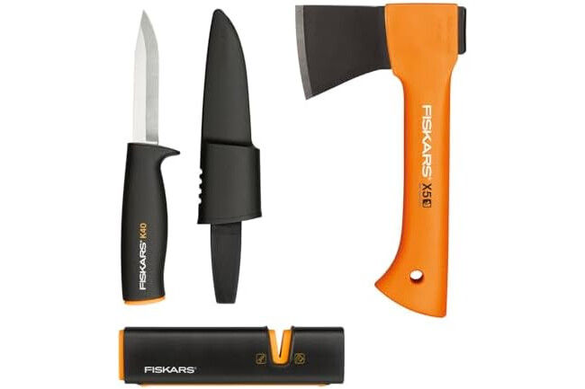 Fiskars Set para Estufa de Chimenea, Hacha de recreo X5-XXS, 23 cm, Afilador de hachas y cuchillos Xsharp, Cabeza de afilado de cerámica, Cuchillo universal K40, Incluye funda, 22,5 cm, 1057913.