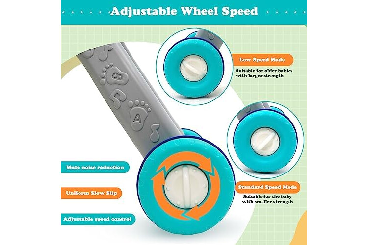 【Control de velocidad】 Los neumáticos de este andador de aprendizaje para sentarse y pararse están cubiertos con anillos de goma antideslizantes, que pueden aumentar la fricción con el suelo y cambiar la capacidad de aceleración. Y la rueda trasera puede ajustar la velocidad adecuada para satisfacer las necesidades de caminata del bebé en las diferentes etapas.