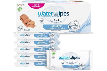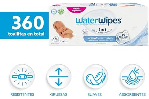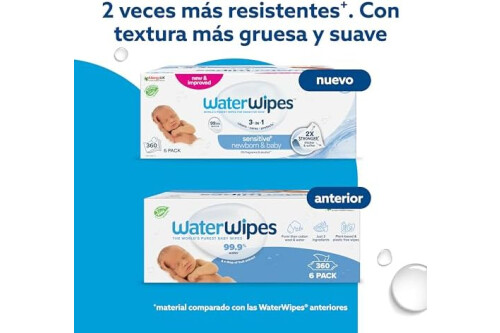 WaterWipes Sensitive+ Newborn & Baby Wipes, Toallitas Para Recién Nacidos y Bebés, 360 unidades (paquete de 6), 3 en 1 Limpia, Cuida, Protege, 99,9% Agua, Sin perfume