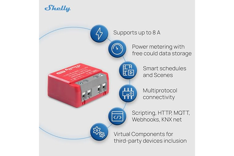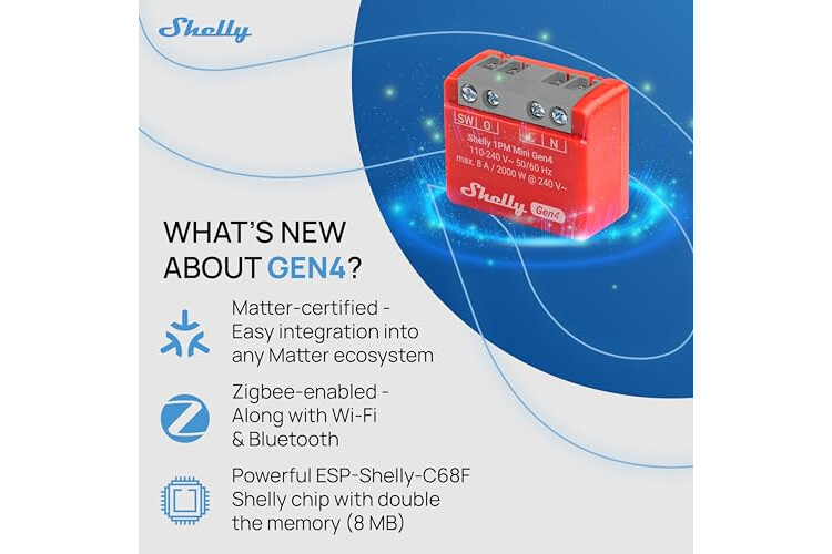 𝑰𝒏𝒕𝒆𝒓𝒓𝒖𝒑𝒕𝒐𝒓 𝒊𝒏𝒕𝒆𝒍𝒊𝒈𝒆𝒏𝒕𝒆 𝑴𝒂𝒕𝒕𝒆𝒓 (8 A a 240 V AC y 5 A a 30 V DC) – Equipada con un chip Shelly (8 MB), esta nueva generación de interruptores Shelly es compatible con Matter y se integra sin dificultad en su ecosistema de dispositivos certificados Matter