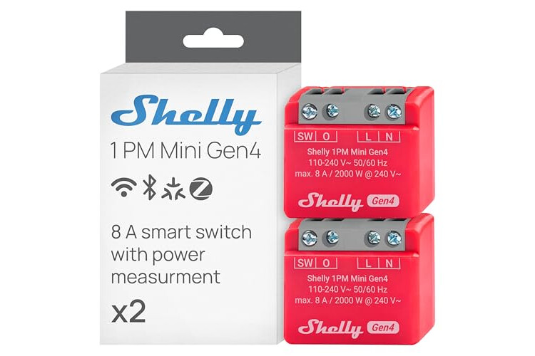 Shelly 1PM Mini Gen4 – Módulo interruptor inalámbrico Matter, Zigbee y Wi-Fi, 1 canal 8A, Medición de consumo de energía, Relé de luz, Control por app y por voz Alexa, Google, Apple HomeKit - 2 Piezas