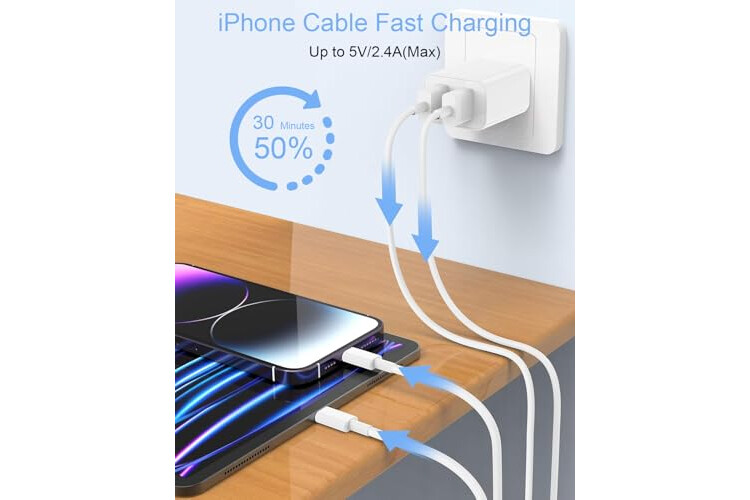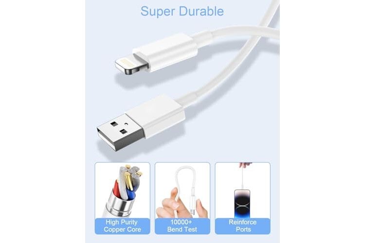 Cable iPhone de Carga y Sincronización Rápida: El cable lightning usb soportar hasta 2.4A Carga rápida de y velocidad de transferencia de archivos e imágenes de 480 Mbps, los archivos y las imágenes se pueden transferir en segundos. Puede utilizar el cable carga rapida iPhone para cargar el iPhone 14 13 12 de 0% a 50% en 30 minutos. Con este cable para iPhone, podrás disfrutar de carga rápida y sincronización al mismo tiempo.