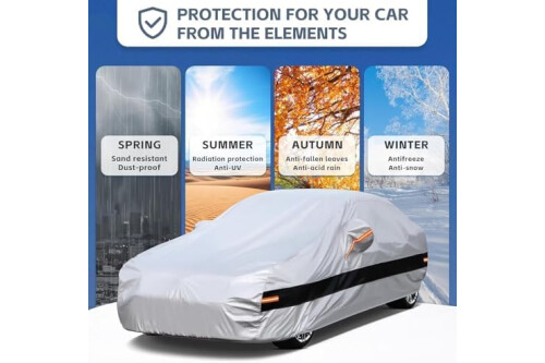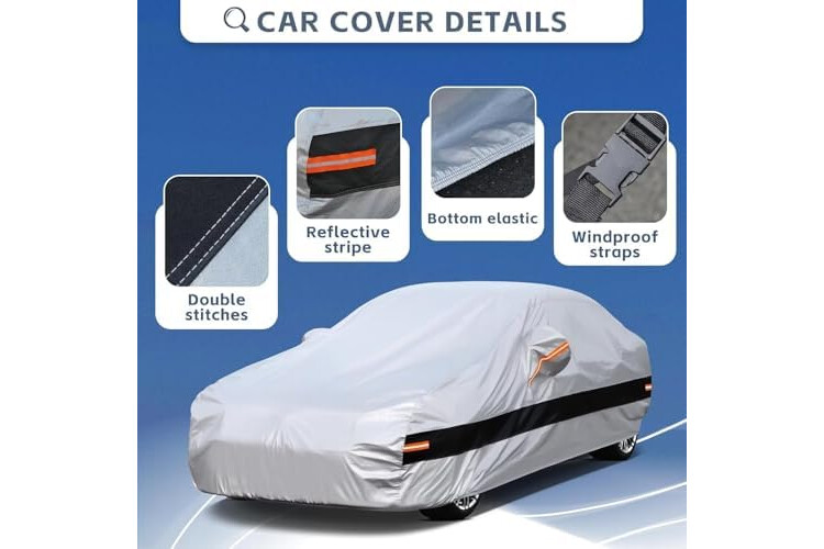 【Material mejorado】-1: la funda de coche resistente Holthly adopta 10 capas de material compuesto. 2: La superficie de polietileno grueso hace que la funda sea 100% impermeable y transpirable, mientras que mejora la resistencia a los rayos UV para garantizar la durabilidad en condiciones climáticas extremas como sol intenso, lluvia y nieve. 3: El algodón grueso del interior mejora la resistencia de la funda, mejorando su resistencia al desgarro y a los arañazos.