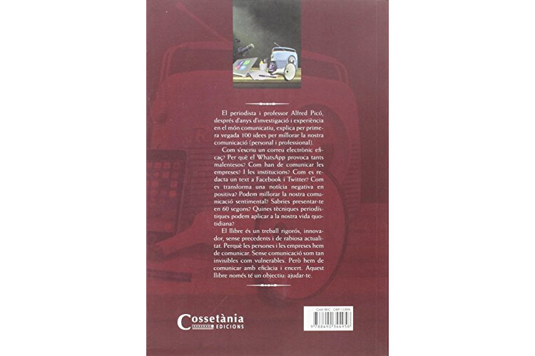 El periodista i professor Alfred Picó, després d'anys d'investigació i experiència en el món comunicatiu, explica per primera vegada 100 idees per millorar la nostra comunicació (personal i professional). Com s'escriu un correu electrònic eficaç? Per què el WhatsApp provoca tants malentesos? Com han de comunicar les empreses? I les institucions? Com es redacta un text a Facebook i Twitter? Com es transforma una notícia negativa en positiva? Podem millorar la nostra comunicació sentimental? Sabries presentar-te en 60 segons? Quines tècniques periodístiques podem aplicar a la nostra vida quotidiana? El llibre és un treball rigorós, innovador, sense precedents i de rabiosa actualitat. Perquè les persones i les empreses hem de comunicar. Sense comunicació som tan invisibles com vulnerables. Però hem de comunicar amb eficàcia i encert. Aquest llibre només té un objectiu: ajudar-te. _"Editat amb la col·laboració del Departament de Cultura de la Generalitat"_