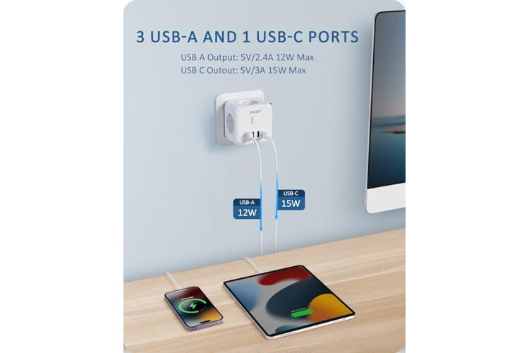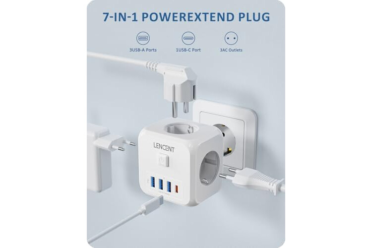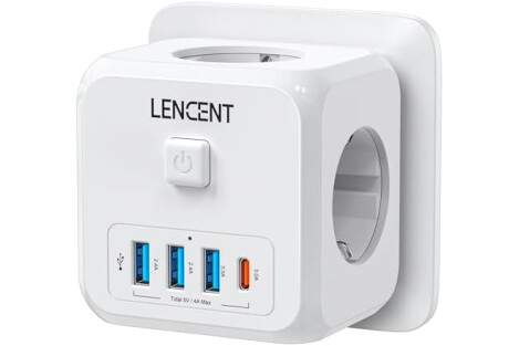 7 en 1 Enchufe USB Cubo: LENCENT enchufe cubo USB incluye 3 salidas de CA, 3 puertos USB y 1 puerto USB-C (cada puerto USB A podría ofrecer una corriente máxima de hasta 2,4 A, mientras que la salida del puerto USB C es de 5V/3A, 15W), por lo que se puede utilizar para cargar muchos dispositivos al mismo tiempo. Es compatible con aparatos como ordenadores, teléfonos móviles, tabletas, dispositivos con puertos USB, etc