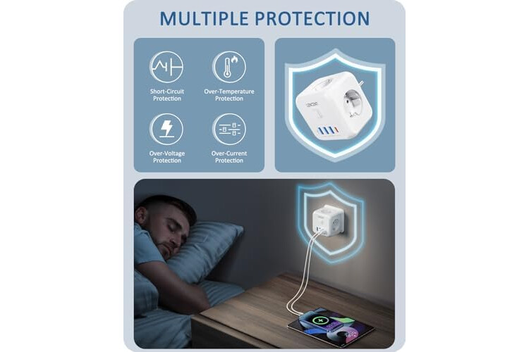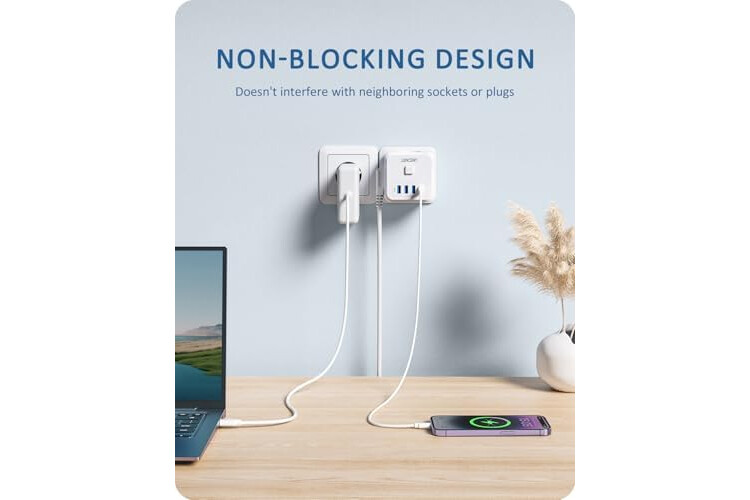 Diseño sin Bloqueo: El diseño único del enchufe cubo hace que el espacio entre cada entrada sea lo suficiente separado, que le permite conectar 3 enchufes grandes, 3 USB y 1 USB-C al mismo tiempo sin bloquearse entre sí