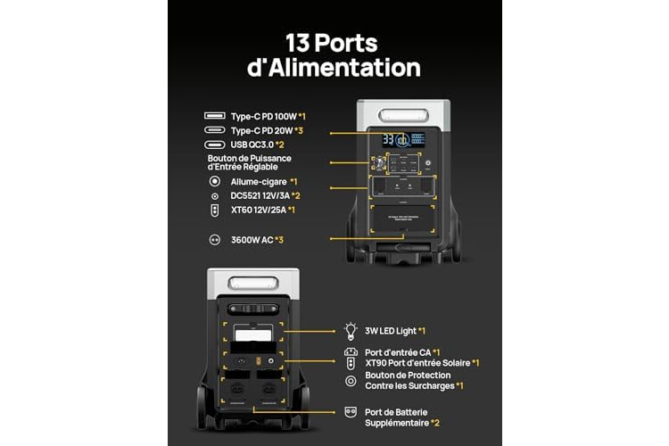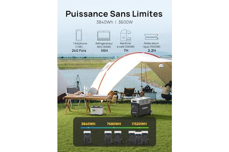 【Potencia de 3600 W y capacidad 3840 Wh】Salida de CA de 3600 W y capacidad de 3840 Wh para alimentar simultáneamente varios dispositivos. Ideal para emergencias en casa, acampar o viajar.