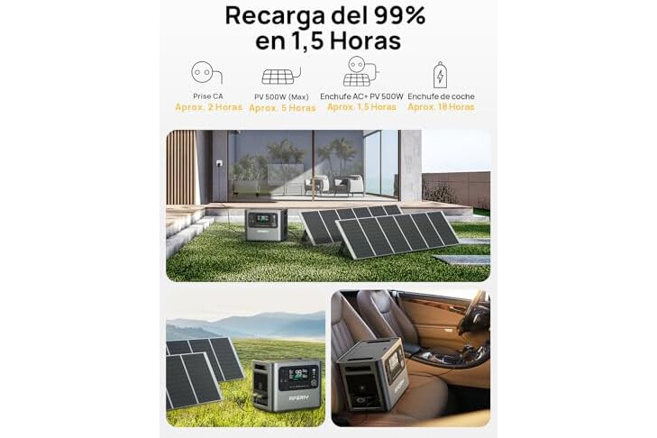 【Carga Rápida en 1,5 Horas】4 modos de entrada: red eléctrica (220-240V, 1100W), panel solar (500W, 50V, MC4-XT90), cargador de coche o panel solar solo. Al combinar la red eléctrica y el panel solar, la carga se completa en 1,5 h; solo con la red eléctrica en 2 h. El controlador MPPT optimiza la energía en todos los climas.