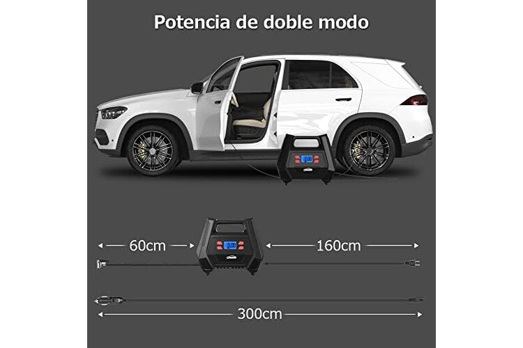 Fuente de alimentación de modo dual: Inflador ruedas coche tiene dos modos de alimentación: cargador de coche de 12V DC, fuente de alimentación doméstica de 220V-240V AC, cargador de coche de 3m y cable de cargador doméstico de 1,6m AC, independientemente de las restricciones ambientales